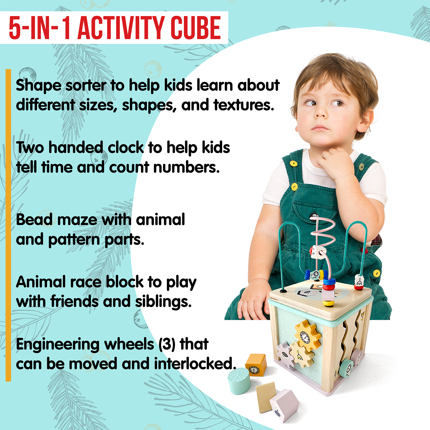 • PROMOTES PROBLEM-SOLVING AND CREATIVITY: Too many kids are staring at screens today, failing to create new games, scenarios, and solutions in their minds. With this wooden play cube, and 5-in-1 activity options available, watch your toddler solve puzzles and explore their imagination. This will help them develop self-esteem and confidence as they get older.
