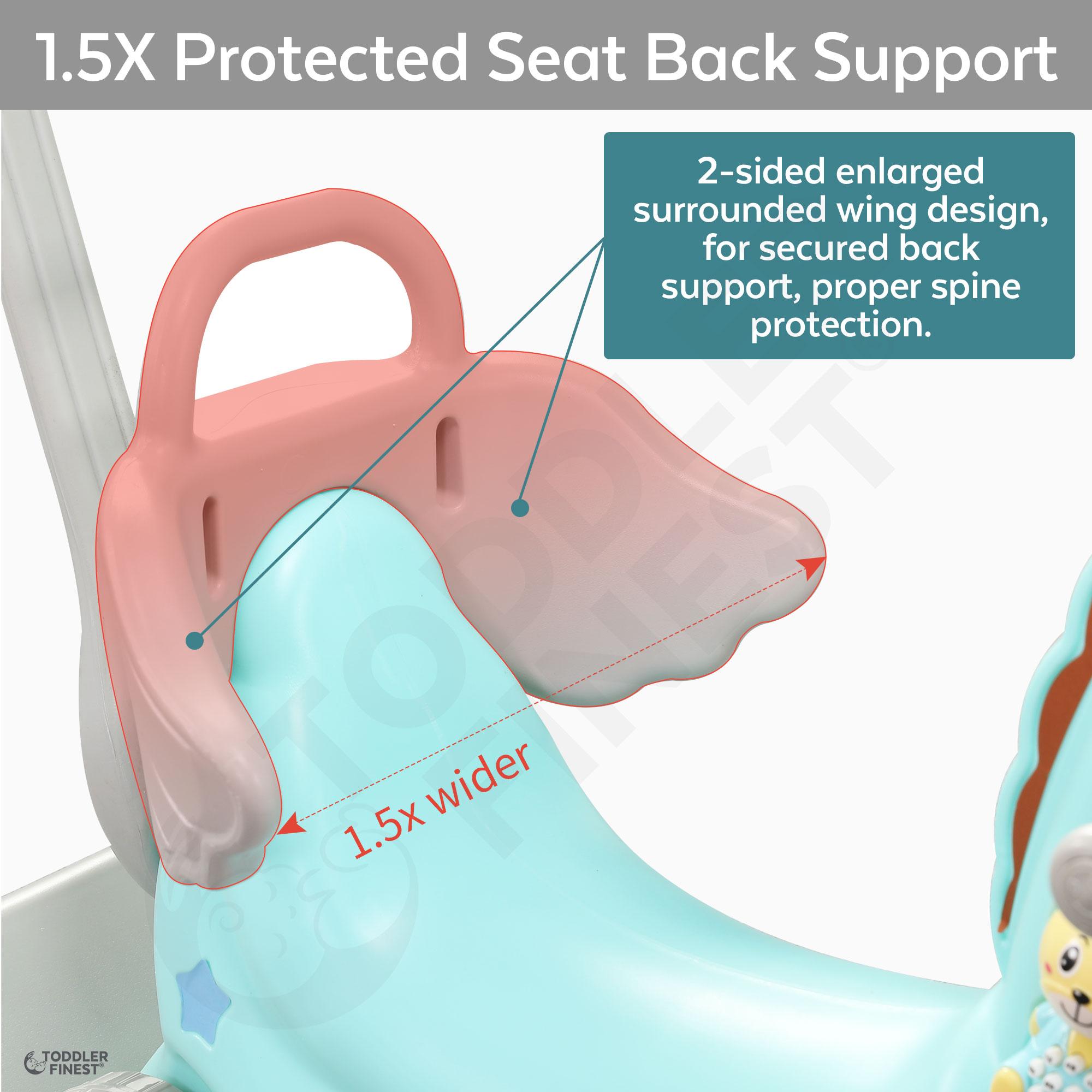 ❤️1.5X THICKER & LARGER, ERGONOMIC: Compared to other brands, our rocking horse comes with 2-sided enlarged surrounded wing design, for 1.5x better back support and spine protection. The safety seat is designed in 1.5X elongated U-shape, with built-in safety belt for good sitting posture development. The anti-slip / anti-overturn smart mechanism automatically balance swing force to ensure safety while riding. Product size: 77*88*51 cm. Weight: 4 kgs.